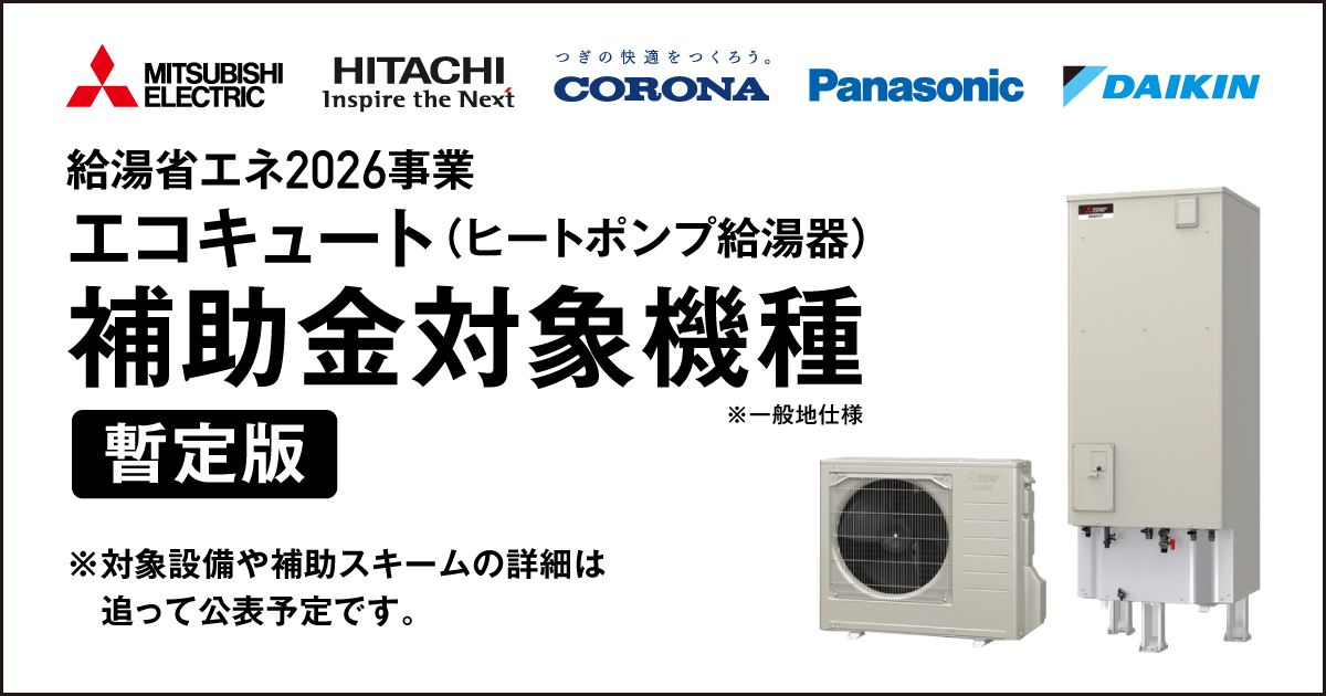 エコキュートのメーカー別(三菱・パナソニック・ダイキン・日立・コロナ)の補助金対象機種を一挙にまとめています。給湯省エネ2026事業の補助金を活用してエコキュートの導入を検討している方は是非参考にしてください。